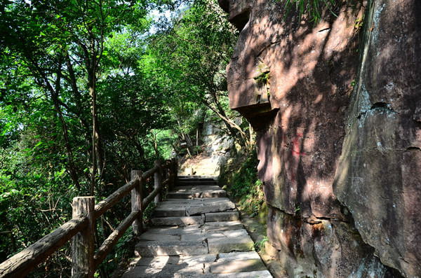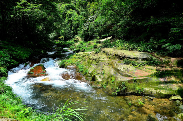 金鞭溪在两峡之间左右盘绕而去,一条青石古道顺流而下,沿途林木掩映,峰回水转,倒是十分幽静清凉。