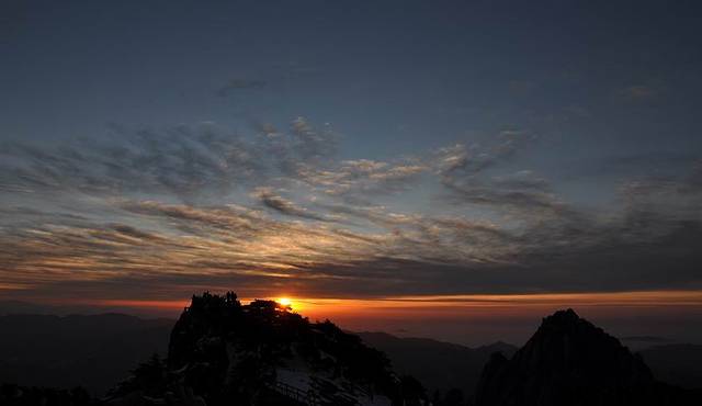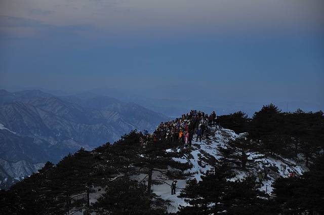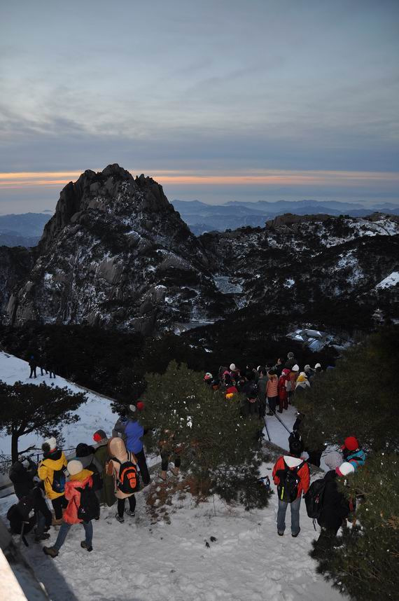 这是新年的第一天,早上6点起床,因为日出会在7点03分~~这是我此行最主要的目的,我要在黄山看新年的第一抹阳光!!!整装待发,把自己包裹的严严实实出门了~到光明顶还有20分钟不到的山路,蒙蒙亮的天,路上已经很多去看日出的人了~~