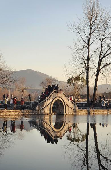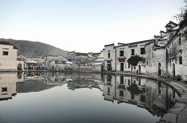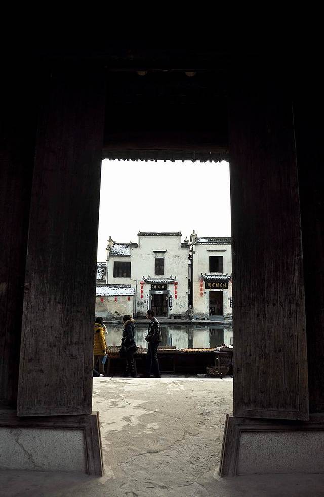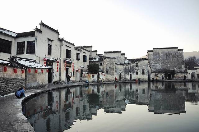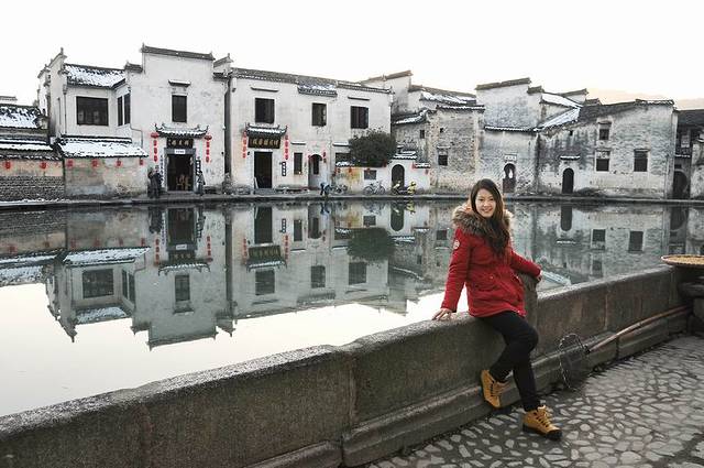 其实我对这样的古村落并没有太浓的兴趣,还好临近傍晚,人少了,要不我会更不喜欢!!进去转了一会就摸不着背了,巷子都很窄,化过雪的石板路湿漉漉的,所以没一会我们就向村民打听宏村的标志性地方,话说我们很俗气,见人问的是“那个大水塘在哪?”的确那就是个大水塘,我也不愿去记住它的名字!反正后来在村中心找到了!!!!水并不清!