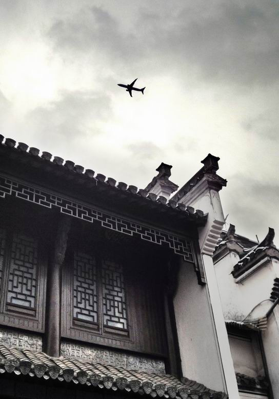 突然抬头天上一架飞机飞过,速度的拍了下,古今结合了,哈哈