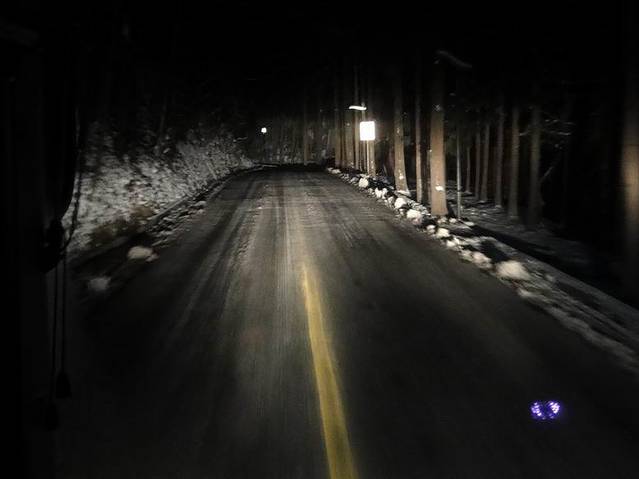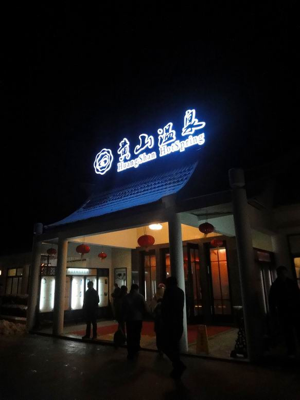 接下来就是要去黄山了,从黄山市区到黄山还有好几十公里,依然上高速走。在傍晚4点半过点到了黄山我们住宿的地方,就在山脚下,我们放下行李就准备去夜泡温泉了。因为同行的玩过3次黄山,人家知道可以直接开车到半山腰的黄山温泉的,于是自己过去了~谁知道这次在门口的保安不让进,说的上路上都是积雪,私家车不给进,要去游客中心搭旅游车~折腾死了,又回到离黄山南门3公里外的游客点去买票~无语的是我们被告知售票处下班了,说是淡季5点下班,狂晕!好歹也是元旦啊,就不能延长点么!!因为也不止我们要上山,有些游客的住宿就在山上,所以还有一批人在转来转去找办法,还好后来最后一趟上山车的师傅和站里人商量好让我们直接付现金上车,票他们内部明天自己补~坐上车那会真是踏实了!!旅游客车的轮胎都绑着防滑链,上路上的确积雪都冻住了,黑黑的我也拍不出什么,借着汽车灯光来了两张。