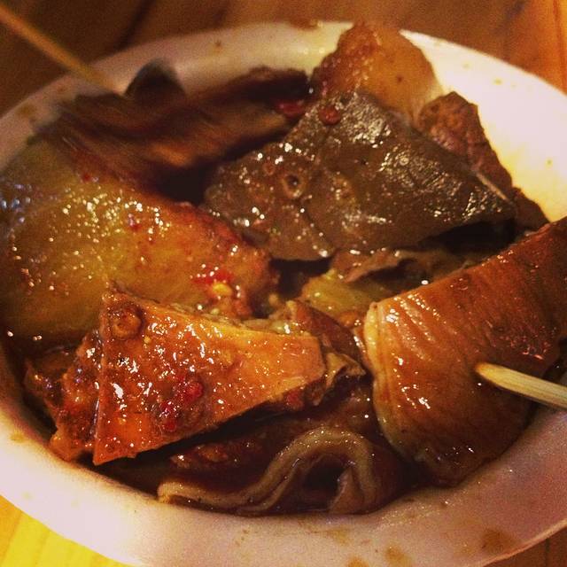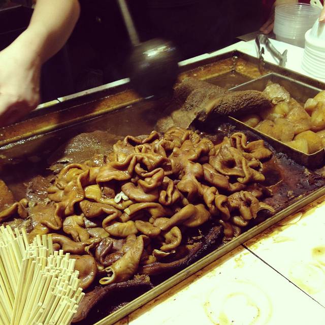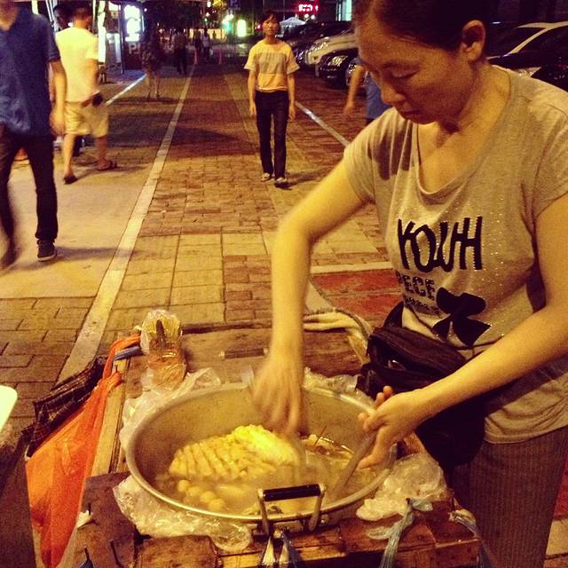 然后就发现了这个小摊子 类似麻辣烫 就是不辣 锅里煮着大肠,肺头,萝卜,牛肉丸,鱼肉丸这些