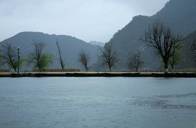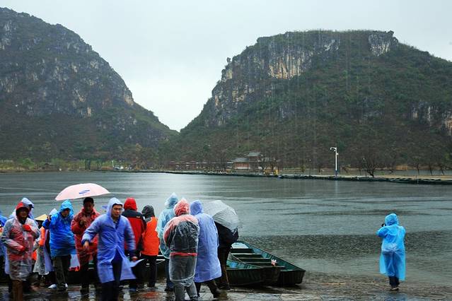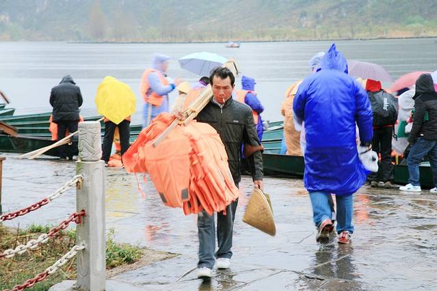 到了游船码头,雨越发的大了起来。于是大家纷纷10元钱买了件劣质雨衣,披挂上阵。