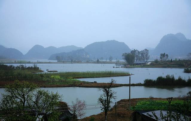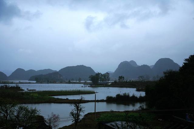 早晨4点半就起床了。昨天还是蓝天白云的一派好景象,到了今天,已经开始悄悄的变脸。抬头看天,不见星星。大家都还带着一丝侥幸的心理。车快到普者黑的时候,开始下起了小雨。等车停稳,大家拿着器材,开始爬山时,雨开始大了起来。拍日出,拍全景的希望是彻底破灭了。大家只好回到车上,开始无奈地等天亮。从5点半一直等到7点多,天才刚刚开始发亮,雨依旧下着。磨磨蹭蹭的等到8点,去农家乐吃早饭。然后,去普者黑的景区大门那里坐手划船游湖。