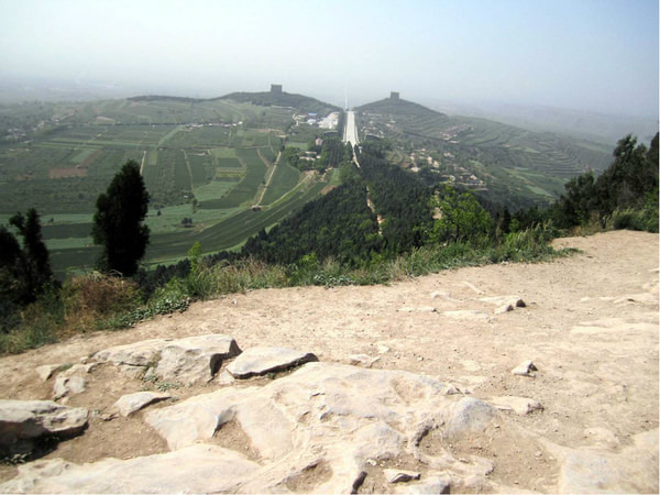 俯瞰对面“奶头山”。 关于乾陵的选址,还有过李淳风、袁天罡的一个传说。两个人分头去找,分别在同一个地方放下一枚铜钱,叠在一起。原来英雄所见略同… 乾陵是少有的至今未打开的帝陵之一,猜测《兰亭序》也许陪葬在里面。