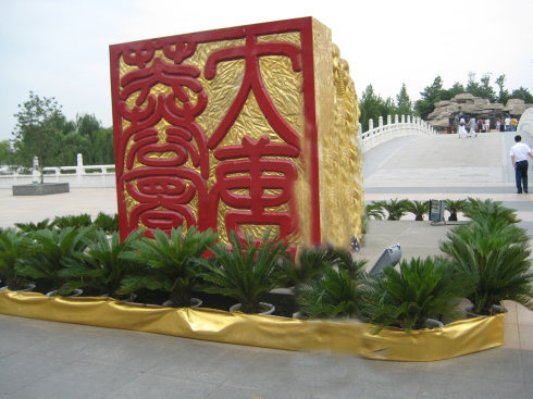 随后进入了大唐芙蓉园,眼前一派皇家园林的气势,刚进门就被那篆刻印章似的“大唐芙蓉园”的金体龙形的硕大红字造型吸引住了,不由停下来拍了一张。