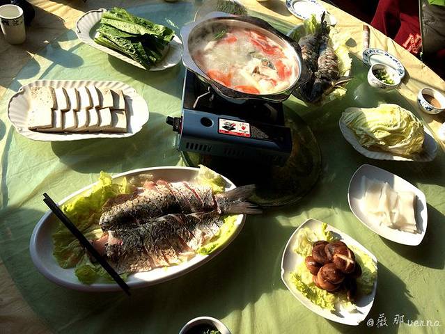 除了玩,当然最主要还有吃,冬吃羊肉夏吃鱼,不过这里冬天鱼锅、羊锅都有,这里本就是一个名为鸽子台的水库,所以自给养殖的水库鱼更是一年四季都不缺。水库养殖的鲟鱼成了冬日里餐桌上鱼锅的主角,而羊锅当地人说都是用当地养殖的山羊炖的,说这里的羊肉不适合涮,只适合炖锅,味道很鲜美。