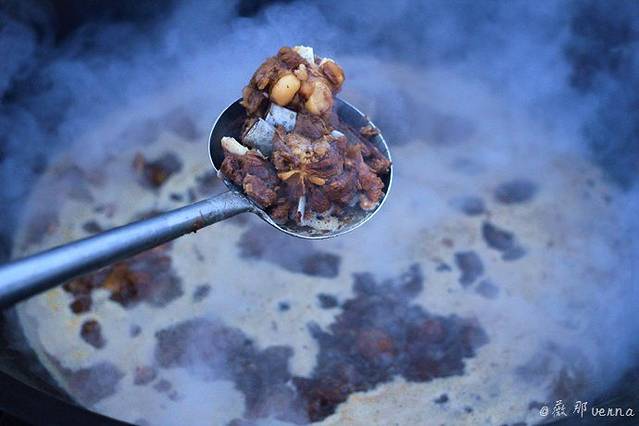大柴锅里炖着鲜美的山羊肉