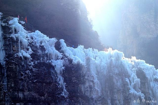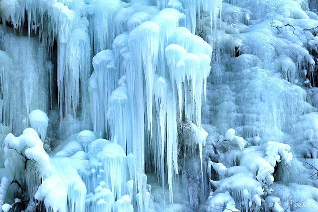 远处山间一泄而下的冰瀑,有的能被太阳晒着,有的背对着阳光,所以温度低,也容冰柱也结的比较多