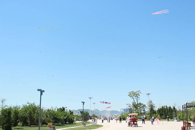 酒店定在了火车站附近,将行李寄存在那里,才出发去我们的目的地——金沙滩! 从火车站到轻轨站,途径一条步行街,路上很多卖樱桃和杨桃的,红的诱人。由于坐错车,经过一小时左右的车程,终于来到金沙滩。下了轻轨、便到处是拉客的出租司机,忽悠我们说到海边还要十几公里。于是我们去找了比较正规的观光车,5块钱/人,却走了不到十分钟就让我们下车了。没错,到了。虽然没花几块钱,却觉得亏大了。 下车后,先是远远地便看到在天空中飞舞的五颜六色的风筝,天气出奇的好,天空蓝的很美。一路走到头,便看到了黄金海岸的标志。整个人都兴奋了起来,飞奔着向前。