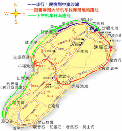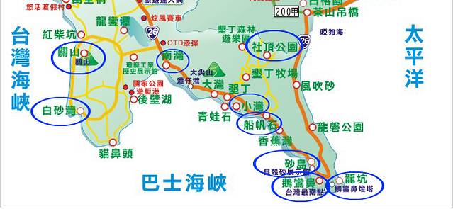 垦丁还是比较大的,一般需要玩三天以上。我们在垦丁只待了一天一夜,由于有凯伦大哥做导游带着,效率很高。今晚去了白沙湾、出海口、出火、恒春老街和垦丁大街。第二天去了南湾、社顶公园、小湾、船帆石、砂岛、鹅銮鼻、最南点和关山。当然还是有很多遗憾没去到的,但已经很令人满意了!