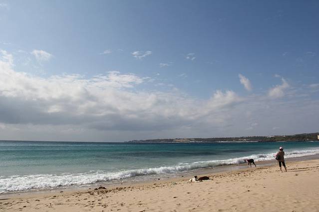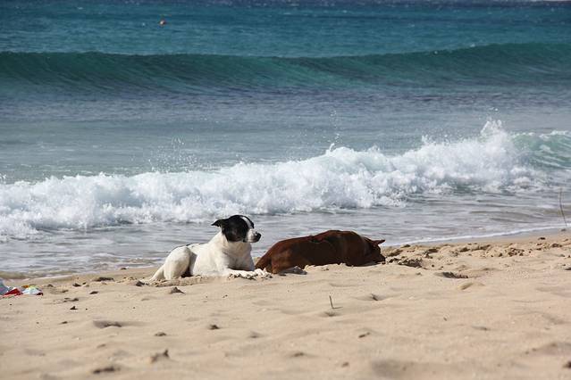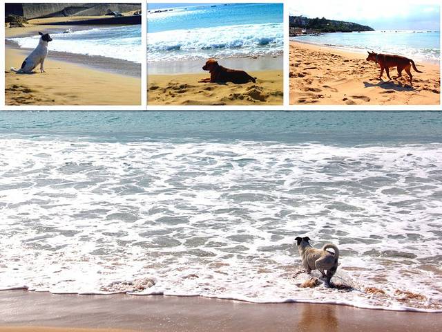好多狗狗在海滩上,它们估计被游客玩弄惯了,如此淡定。