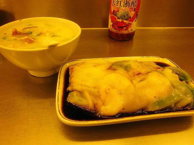 推荐:这家只卖三样小吃——爽鱼皮(22元)、艇仔粥(7元)和猪肠粉(3元)。
