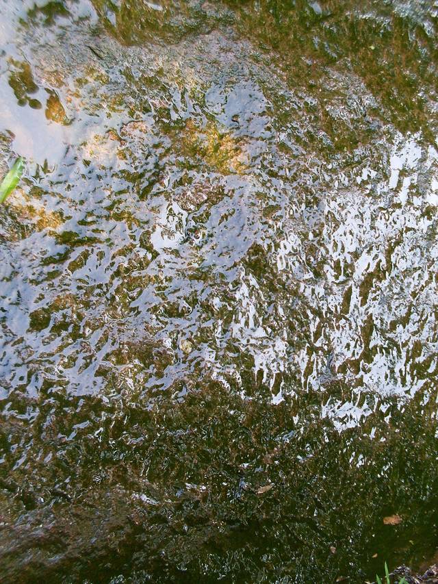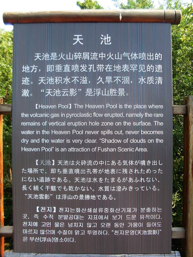 没法,我走到附近浮山中学的路口,看有其它车不。一个当地男面的司机问我去哪,我说去浮山正大门。他说要20块,我不肯,说15块还差不多。我说我刚才上当了,被人带到了后门。这时,一直站在一辆三轮车后面的大姐马上给予了同情,她问我是不是去浮山玩,我说是的,进一步赌气说我现在不想去了。她问我为什么不想去了,里面很好玩。我说太贵了。她说那我告诉你一个省钱的办法。然后她说她让开这辆三轮车的阿姨送我去一个村口,那里有块牌子写着“游客止步”,她让我偏不止步,然后到村里,沿着小路上山,不用买门票,只收我15元路费。我思考了一下,觉得可行,如果进不去再回大门领取订的票。于是,我上了三轮车,开三轮车的阿姨果真把我送到了正门,然后拐弯进入旁边一条新铺的路。在一个“游客止步”的大牌子下停下来,让我进去。抱着试一试的态度,我走进了村子。首先走错了,走到了一家农户前,然后折回,碰上一个从田里摘菜回来的大叔,我含笑问大叔怎么上山。大叔说:“要么你去大门买票进去,要么你就从前面那个池塘边的路口,往左走,那可以进去。”根据大叔的指示,我找到了一条乡间小泥径。没走一百米,眼前就出现一块大岩石,平躺着。上面一截被绿色的丝网围了起来。附近还有一块石碑,写着“烂柯石”。恰好我的前面走着一位村民,他提着一袋鞭炮。我看到他从围栏下一处破网里钻了进去。嘿,原来真可以上山。我为即将省掉90元门票感到兴奋,同时又有些忐忑不安。我也从破网里钻了过去,然后顺着指示牌一路游逛,发现天池就在附近,于是经过洗墨池、百步云梯,直达天池。洗墨池、百步云梯都不怎么稀罕,跟天柱山的百步云梯比较,简直是小巫见大巫。倒是天池值得一说。据说这是古火山口,为火山熔岩地貌。不过上去后我有些失望,比想象中要小得多。面积相当于一个小池塘,里面水草丰茂。附近岩石上有很多气坑,当初火山爆发时应该很壮观。