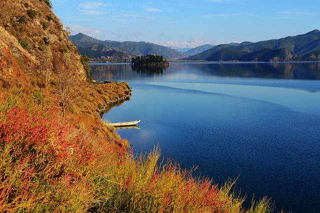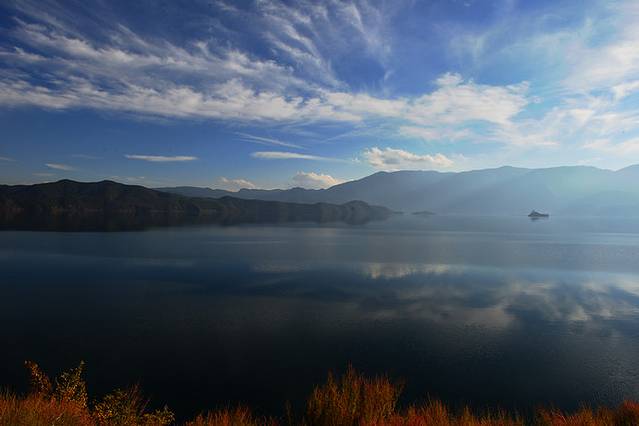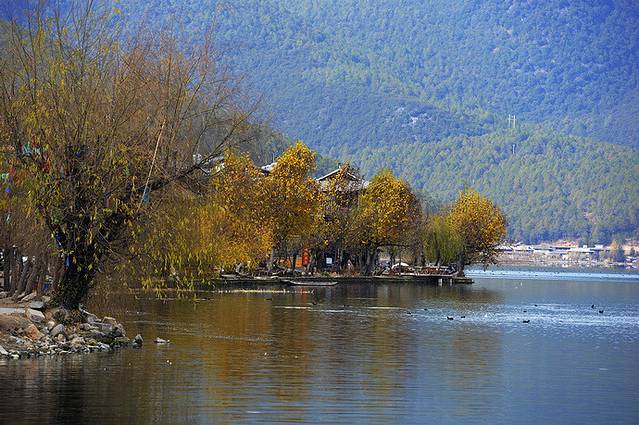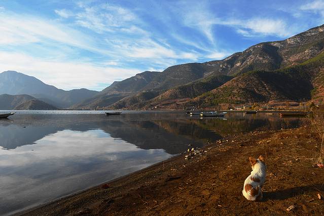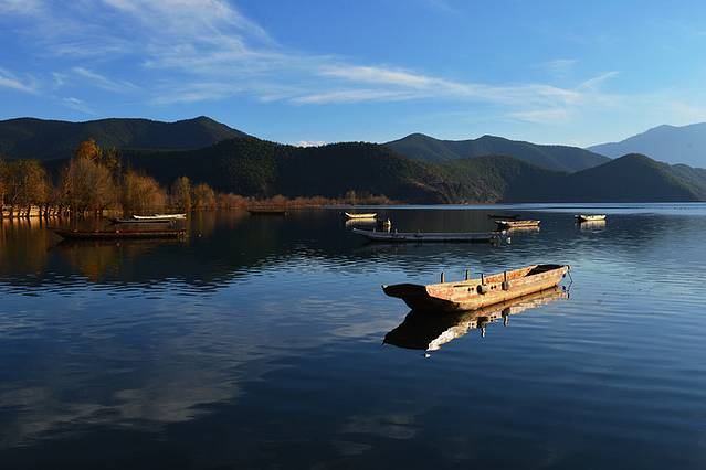 从丽江到泸沽湖280公里的山路,山路的阴面有暗冰,幸好有当地的朋友开车带路,一路还算顺利。这里游客没有往日那么多了,但依然残有秋天的景色。虽然是第一次来这里,但摩梭族、女儿国、走婚这些传说早已印在脑子里。泸沽湖水很清、山很绿、天很蓝、岛很美,山寨与半岛相连,水鸟与湖水相伴,水天一色无处不散发着静寂和安宁的气息。照片拍摄于2013年12月9日~10日泸沽湖