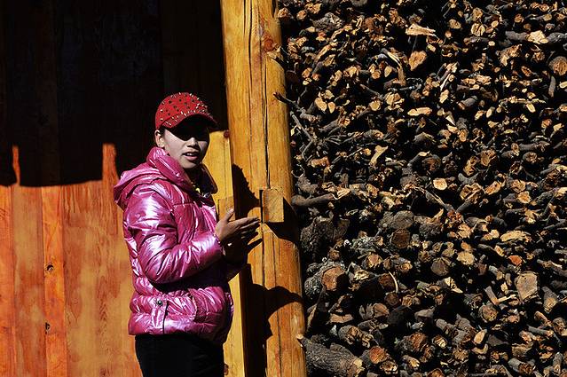 砍柴是摩梭族妇女的日常工作, 扎波娜金娜姆家的大门外整齐的堆满了木材,足足有两米高六米长。