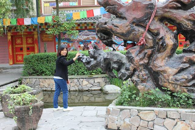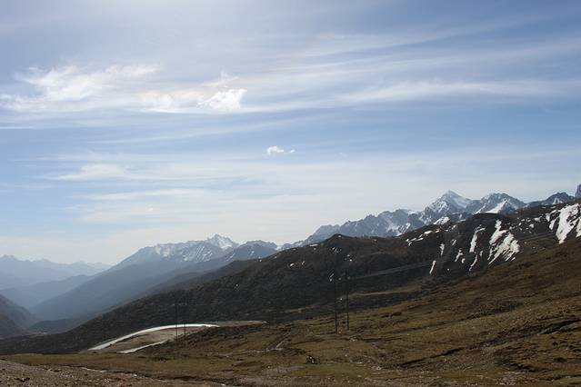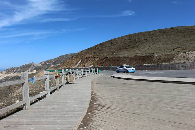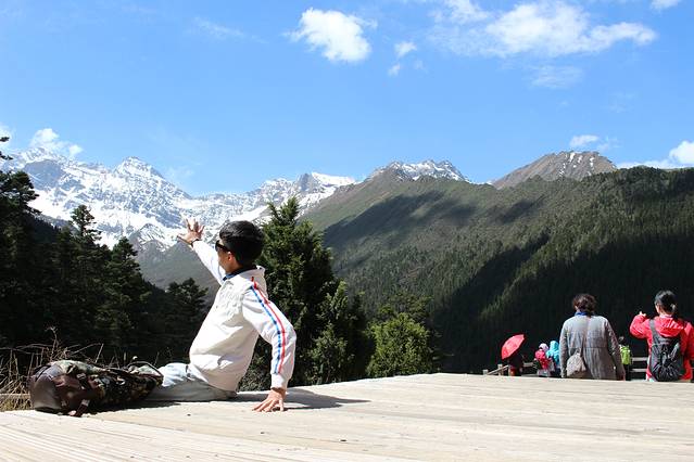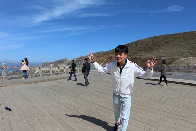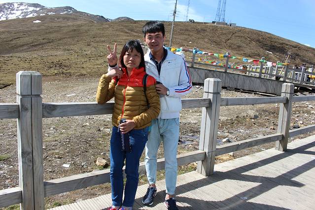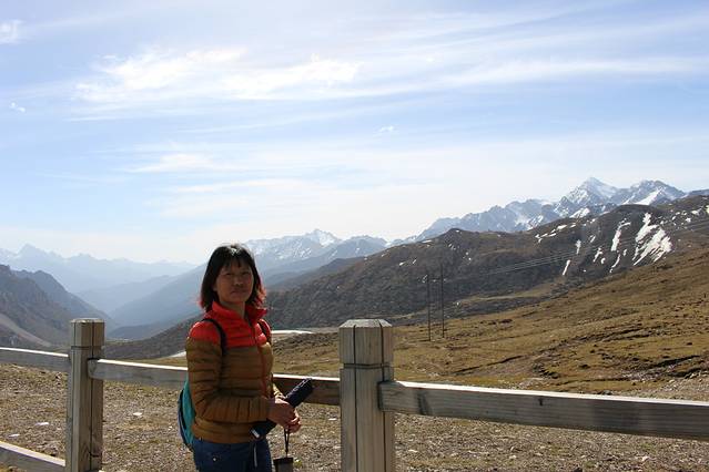 去黄龙打路上经过一个景点“雪宝顶”,雪山就在面前,据说海拔有5000多米呢,在车上看着外面是大太阳,没想到下车后感觉特冷,风也特别大
