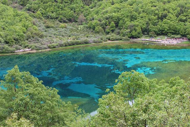 此照片是从五花海观景台上拍摄的,需要说明的是这个观景台的位置处于路窄及坡道处,所有没有观光车站点,最好的游玩线路就是下观光车后步行到五花海后不过桥,直接选择左边的栈道,上坡到观景台俯瞰整个五花海,然后沿栈道下坡,跟着栈道走环游整个五花海最终到达五花海出入口处,然后乘坐观光车到达下一个景点游玩,由于整个五花海还是比较大,若你想看最完美的风景而不走回头路就可以参照我的线路