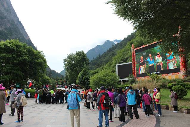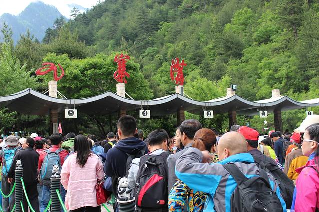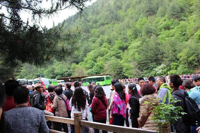 检票进去后接着就是乘坐观光车,我想说现在既不是九寨沟风景最好的时节,也不是国定假日,为什么还是这么多人,后来才知道,九寨沟随时人都多,这已经算少的了