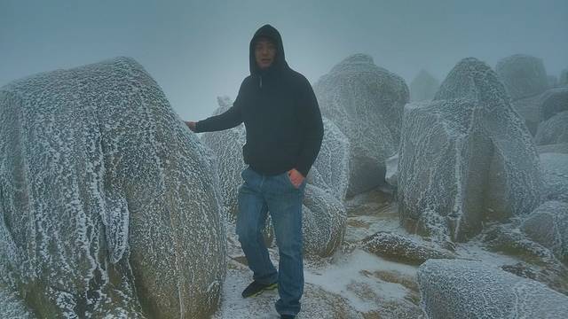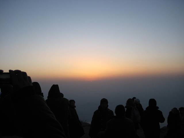 七点出发步行去红门。这天还是阴沉沉的,上山的时候阳光明媚,快到中天门的时候下起小雨来了,中天门往上爬飘起小雪,山顶又是风雪交加。别提了,一天时间里体会到了阴晴雨雪,春夏秋冬。