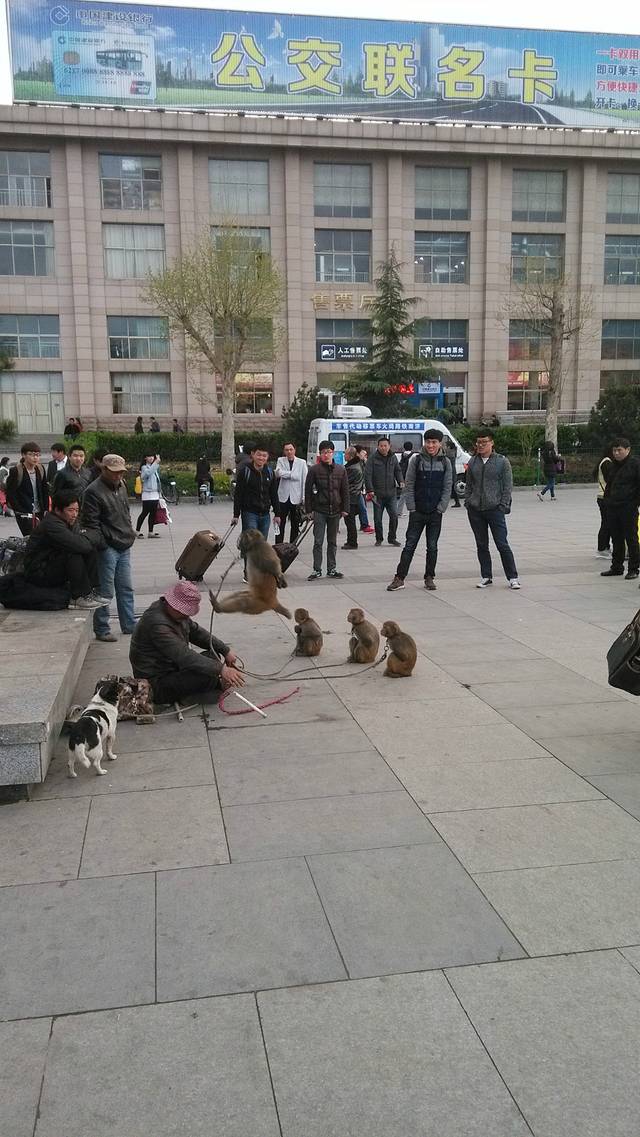 泰山火车站广场又见耍猴的,这猴子轻功不错啊。