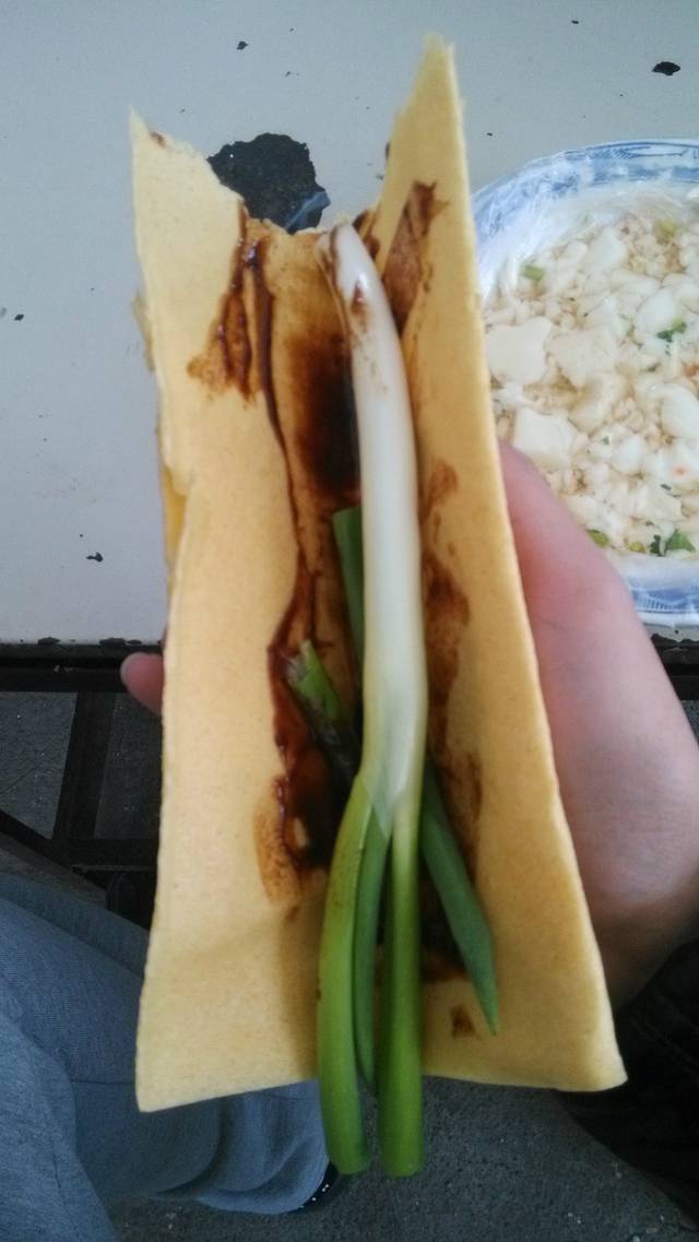 早餐一碗豆腐花外加煎饼卷大葱。来到山东怎么能不吃煎饼卷大葱呢。