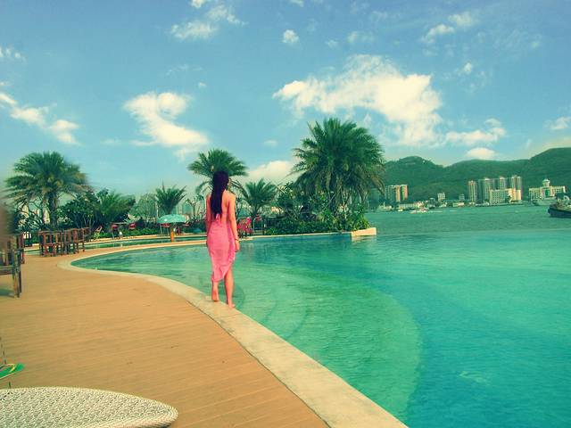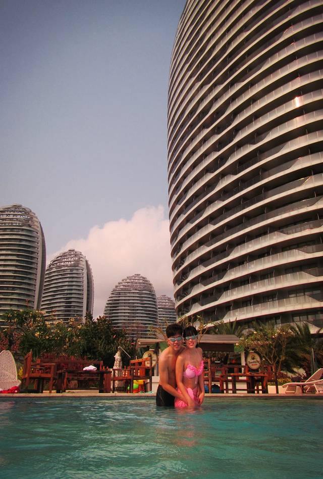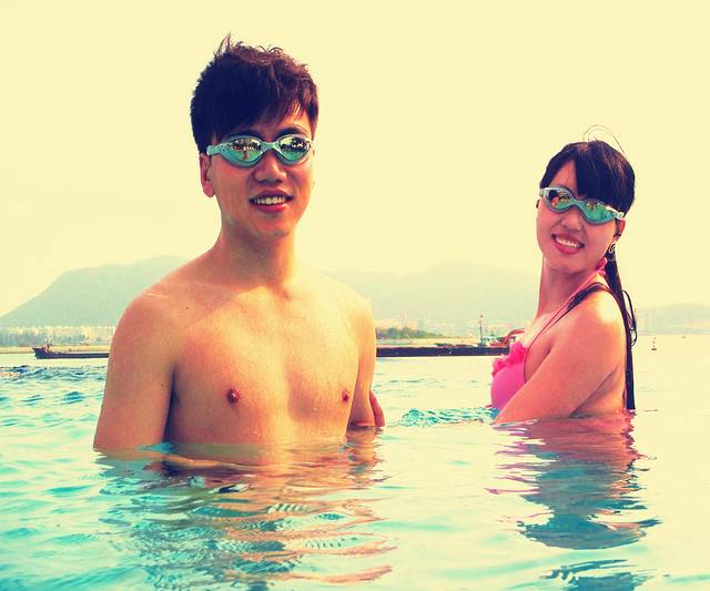 今天下午很幸运,游泳的人非常少,只有5个人,我们是直接换好泳装,外面披着睡袍就OK了,无边泳池,后面就是无垠的大海
