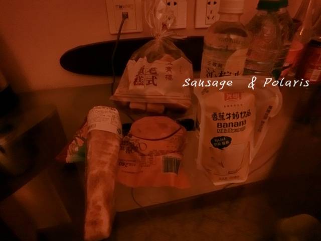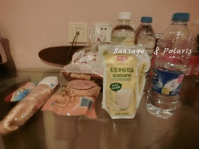 在酒店楼下的连锁超市(24小时营业的哦,突然记不住名字了)买的第二天早饭。因为第二天着急去金州参加婚礼,五点多就要起来坐最早一班轻轨,所以感觉时间比较紧张, 没那么多时间吃饭。早饭36.5元吧。老式面包9元,香蕉牛奶5.5元,另外一个奶油面包5 6元左右,香肠6元(稍后告诉你们为何我偷笑,哈哈)。