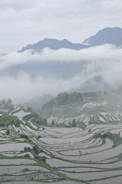 因为下过雨,即使在山顶也体会不了绝顶一览众山小的感觉。不是因为山不高,而是因为山太高,望眼而去,能看到的是一片云海,只有近处看到的是云海中的梯田。仿佛给梯田也披上了一层神秘的面纱。