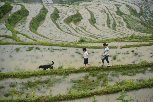 偶遇一对母女还有一条小黑狗,虽然不知道他们的去向,但总觉着这一副场景很和谐。曾经是否也向往过这样的场景:忘却一切烦恼,只要忘情的走在田埂上。那些喧嚣与浮华都远离而去,只留下宁静和安详。
