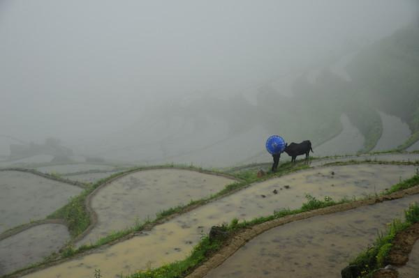 早上下了场小雨,现在淅淅沥沥雨将停。还好天气好转,让我和朋友一起出游也欢快了不少。远处的农民大伯早早地便来到梯田中干活,也许这就是这山里人的生活方式,日出而作,日落而息,平和安详。若是让我一直这样生活也许会受不了,但是偶尔体验下肯定是别有一番风味的。