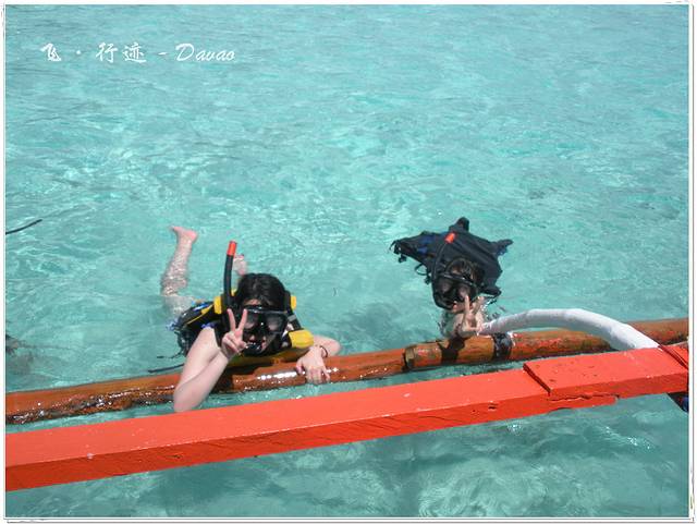 第一次浮潜,我完全没经验,幸好有魏小P和台湾的雅萍雅惠姐妹两帮忙教我们怎么用呼吸管,怎么戴潜水面镜才比较不会进水。关于面镜起雾的问题,还有一个小技巧,在没有带防雾剂的情况下,只要用自己的口水把面镜内部镜面抹均匀,然后用海水洗干净就OK了。虽说听起来有些恶心,但却是很实用的方法,因为我看到跟船的菲律宾小朋友也是这么干的。