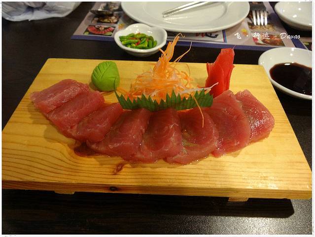 上菜了,首先是生鱼片,生鱼片比国内吃到的要厚一点,绿色的那个叶子状的东西是芥末,很有爱
