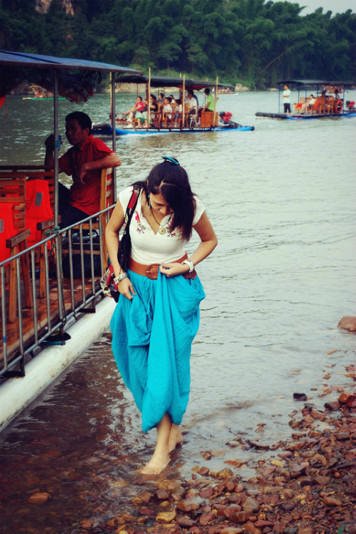 游漓江,是今天的最后一个目的地~~上竹排前,忍不住玩一下水,感受一下这水的凉快~~