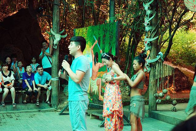 下午划真正的竹排,戏水,本来还打算带相机下车的,幸好最后还是没带,我们船上全是女同胞,结果就是被欺负吧,还是被不认识的游客喷了一身湿到底,连帽子也成了水的玩物,相机在这里的话就成水了,湿了就湿了,那就要玩个尽兴,临走的时候,连我们自家的船大哥也给我喷一个,我好无辜~~