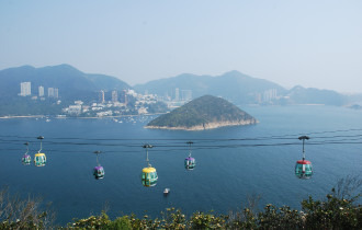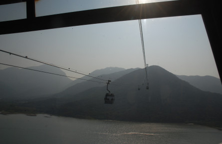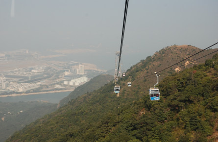 来到东涌,一出港铁就可以看到昂坪360出口的指示,很容易就可以找到缆车的位置。换好门票之后,马上就出发。这个缆车不是独立组合的,而是6个人一个车,同行的有国内同胞还有国外友人。水晶底部,看着就觉得有点心慌,但很快就被美丽的风景给征服,互相不认识的6人都很兴奋,互相帮忙拍照。20多分钟的缆车之旅,在中途居然停了下来,那一刻广播的声音传来过来,说前方有个点出了点故障需要维修,缆车设施安全,请不要惊慌、耐心等候。哇,这又是什么状况,我们就这样定在哪里欣赏了2-3分钟的风景,缆车就恢复行使了,很快就安全来到了目的地。