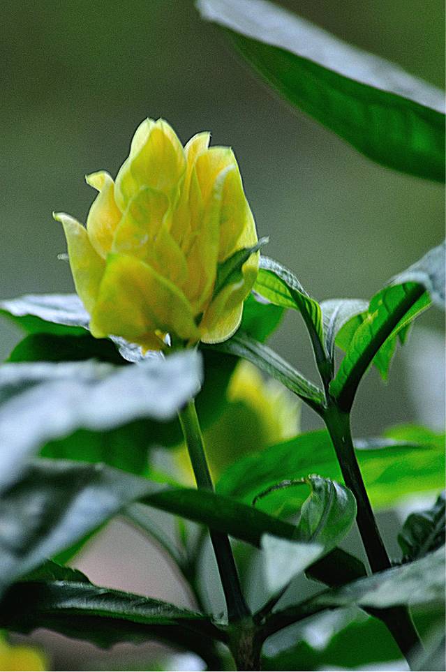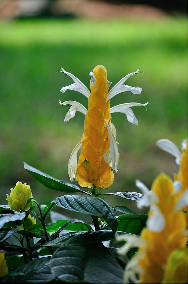金苞花又称黄虾花、珊瑚爵床、金包银、金苞虾衣花。为爵床科常绿亚灌木,茎节膨大,叶对生,长椭圆形,有明显的叶脉,因其茎顶穗状花序的黄色.苞片层层叠叠,并伸出白色小花,形似虾体而得名。因其花期长,观赏价值高。