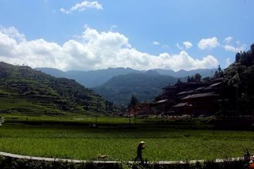 村落倚山而建的千余户吊脚楼,分布两边,或高或低,错落有致。层层叠叠的梯田形成了苗寨的自然背景。