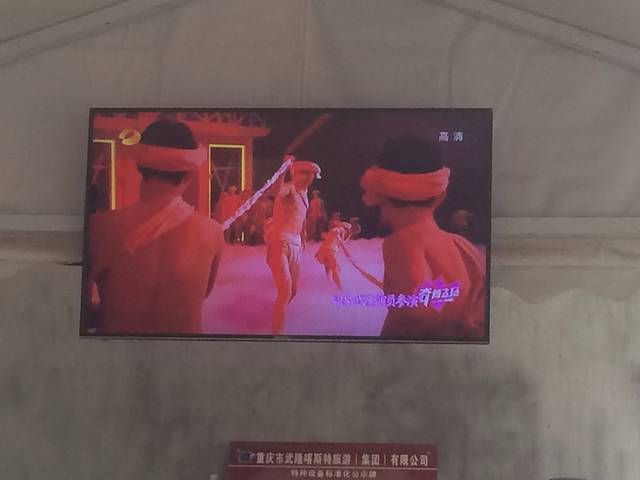 这是入口进来后得一个隧道,大概走了十分钟,隧道墙上都是印象系列得其他地方得演出照片,还有武隆这部印象系列得由来,大概就是原来的人们在长江边用绳子背船那种