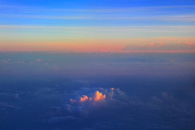 在灰机上左一觉,右一觉,终于看到窗外有了亮光,美丽的朝阳洒在一朵白云上,美不胜收。