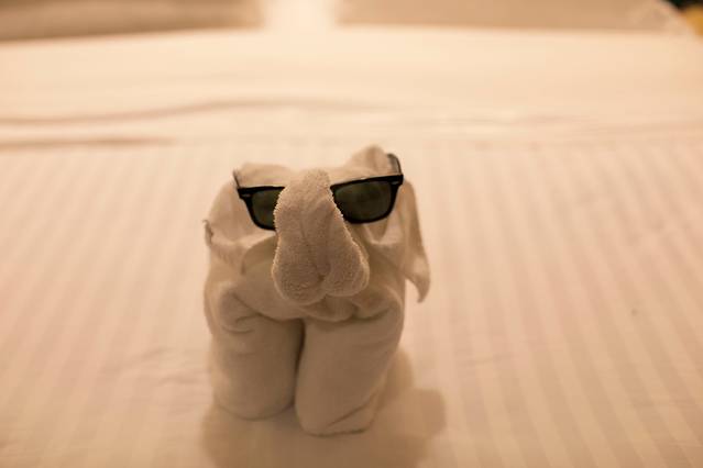 回到房间,毛巾被叠成小象造型,萌萌哒