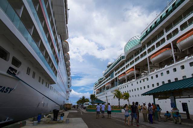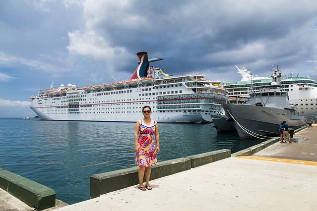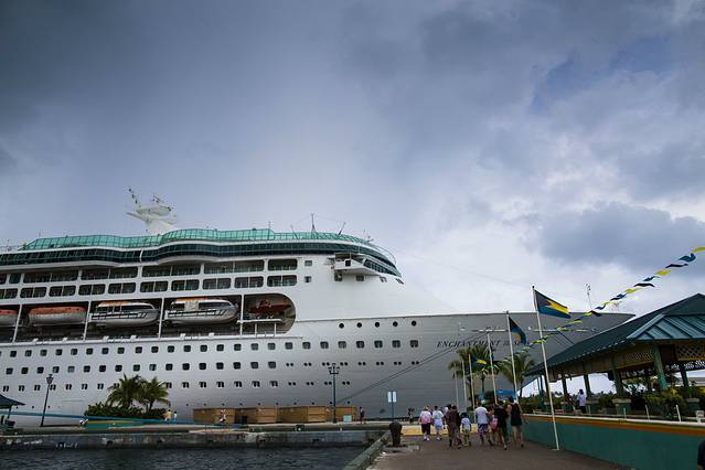 终于等到下船了。 右边就是我们的船,enchantment of the sea, 皇家加勒比公司的。 右边的船比外面小,好像是挪威人。后面去可可湾的时候也碰到这条船在隔壁岛。