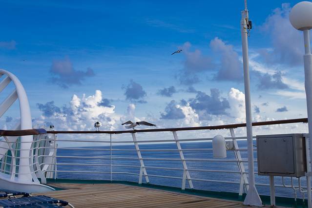 甲板风很大,船舷打了蜡非常的滑,好几只海鸥想停在船舷上又因为风大打滑站不住脚,好好笑
