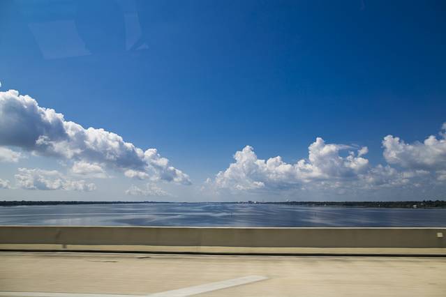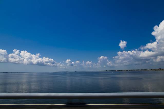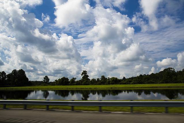 水面很平静,倒映出云朵。 车上抓拍,效果不是太好。