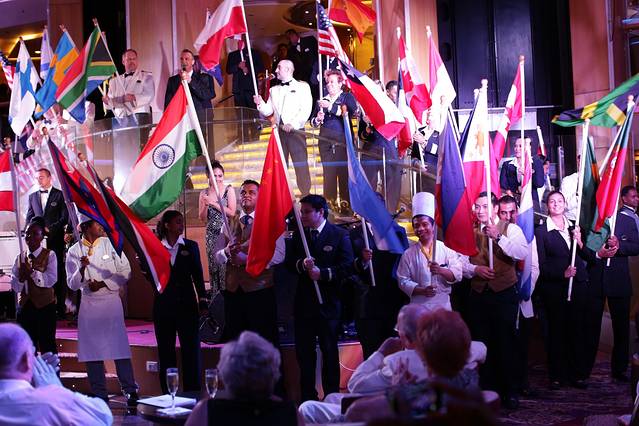 这天晚上所有的船上工作人员都出来跟大家打招呼,船长也出来了,帅得一比