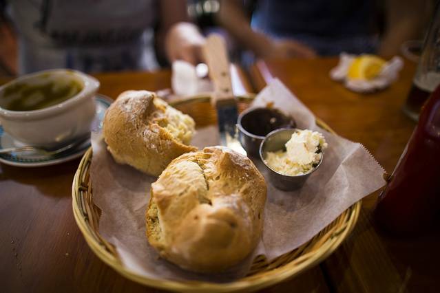 一来就端了一篮面包上来,免费吃,白色的奶油很好吃