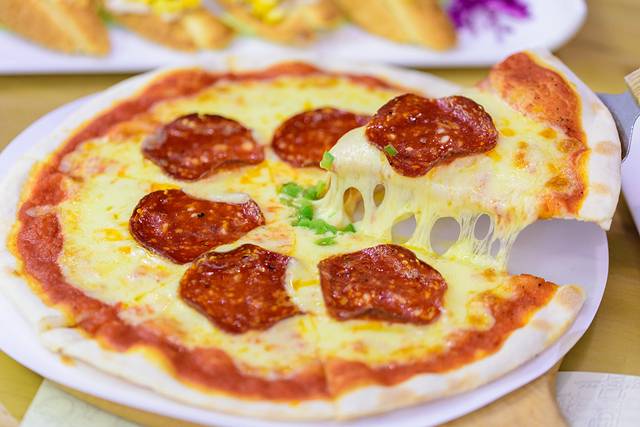 12寸的魔鬼比萨,浓郁的芝士覆盖在薄薄的披萨饼上面加之香肠的嫩香与色泽,让人口水横流。