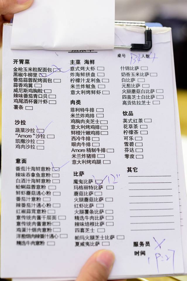 餐厅主要有比萨、意面、沙拉、开胃菜、肉类、主菜等几大类及饮品。