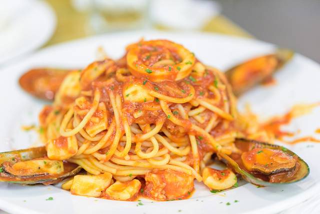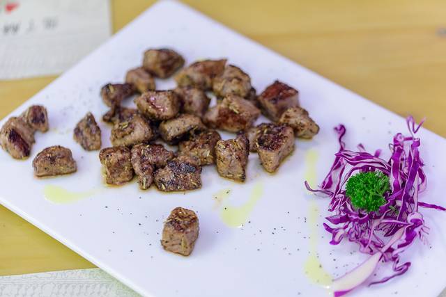 我们点的都是店里的招牌和特色菜品。其中四个小伙伴都认为最好吃的是这个金枪玉米粒配面包。香脆的面包配上松软可口的玉米辅以酸甜可口的金枪鱼酱带来极佳的味觉体验。然后是这款12寸的魔鬼比萨,浓郁的芝士覆盖在薄薄的披萨饼上面加之香肠的嫩香与色泽,让人口水横流。比萨是薄的,个人比较喜欢,那种厚的饼实在是有点受不了。批萨说完当然要说说意面。我们点的这份是番茄汁海鲜意面。劲道的面条配以精选的海鲜,浇上酸爽可口的番茄汁。别有一番滋味。很快就被四个小伙伴解决掉了。考虑到牛排四个人不太好分的情况,没有点牛排,而点了黑椒牛柳里。老板赠送了一盘威尼斯鸡胸粒,开胃菜,蔬菜沙拉也比较特别,并不是放的沙拉酱,而是特殊的调料,吃起来味道也蛮特别的。最后,小伙伴看吃的不太够,又补点了一个菜,大家觉得面包最好吃,于是又点了一份番茄蒜蓉配烤面包。不知道是吃的比较饱了还是其他原因,虽然这道番茄蒜蓉烤面包味道也是不错的但总觉得味道不如金枪玉米配烤面包好吃。大概是缺少了中间金枪鱼酱的酸甜口感。