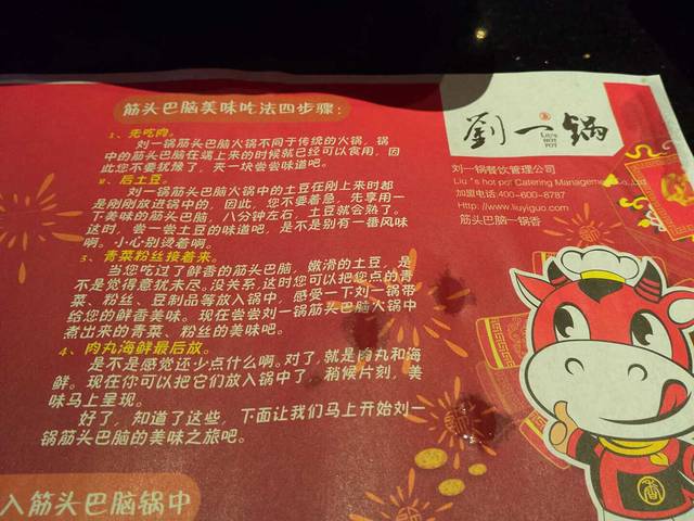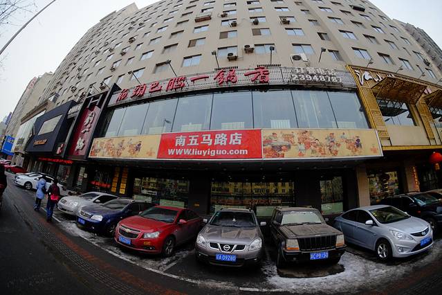 位置交通:刘一锅南五马路店距离沈阳站仅1.3公里,打车起步价就能到,216,261等好多公交都能到附近车站,若行李不是很多甚至可以考虑步行前往。做完长途火车需要好好补补的话来这绝对不错! 店内特色:当然就是筋头巴脑锅这一招鲜。 推荐吃法:吃起来有讲究的!锅刚上来时,服务员会推荐你先喝汤。因为刚上锅汤比较清淡,煮一会之后,汤会比较油。然后菜品吃的顺序也是有讲究的。按照刘一锅推荐的顺序是1先吃肉2后土豆3青菜粉丝4肉丸海鲜。当然对于像我这种肉食动物,当然是不会按套路出牌的。盯着肉,一顿造!整体来说,锅的味道相当不错,尤其是在大冬天去吃,非常的爽。秘制麻将小料也非常给力。 省钱攻略:去之前先在团购网站上团一下,两人三人及多人都有套餐。人均消费四五十左右。相当的实惠。 我们团的是119的三人餐,量非常大,我这样一个吃货加俩美女反正是吃不完的。 美图分享:(部分图用鱼眼镜头拍摄)